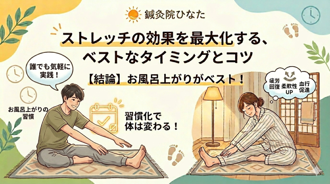 せっかく取り組むなら、最も効率の良い方法で体をケアしたいですよね。今回は、意外と知られていないストレッチの本当の効果と、今日から実践できる「ベストタイミング」についてお伝えします。