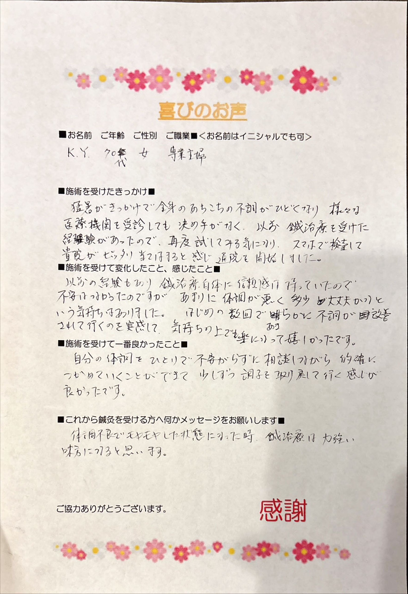 以前の経験もあり鍼治療自体に信頼感は持っていたので不安はなかったのですが、あまりに体調が悪く