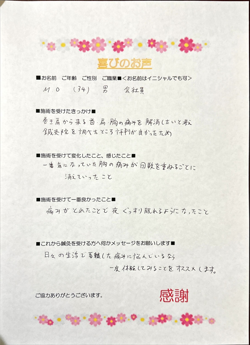 巻き肩から来る首・肩・胸の痛みを解消したいと考え鍼灸院を調べたところ評判が良かったため